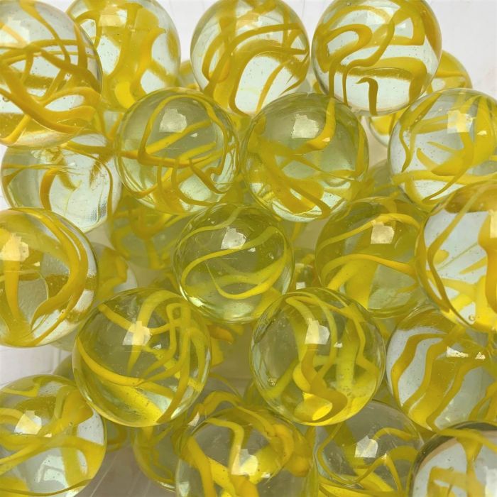 Transparante knikker met gekleurde sliertjes doorheen de knikker. Deze knikker is ook in andere maten en kleuren beschikbaar.