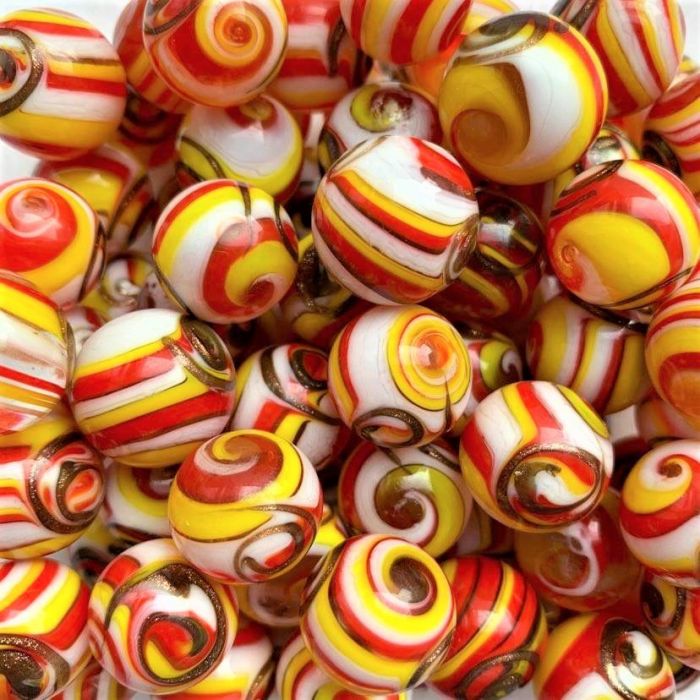 Deze knikker heeft een doorschijnende kern die is omhuld met een spiraal van ondoorschijnend wit, geel en rood glas. De spiraal wordt onderbroken door een draaikolk-figuur in goudpoeder. Bhanvar, de naam van deze handgemaakte knikker uit India, is Hindi voor draaikolk.
