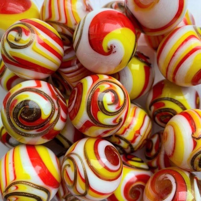 Deze knikker heeft een doorschijnende kern die is omhuld met een spiraal van ondoorschijnend wit, geel en rood glas. De spiraal wordt onderbroken door een draaikolk-figuur in goudpoeder. Bhanvar, de naam van deze handgemaakte knikker uit India, is Hindi voor draaikolk.