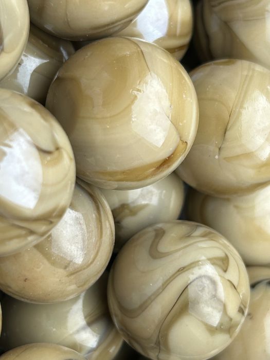 Ondoorschijnend lichtbruine knikker afgewerkt met donkerbruine lijnen.