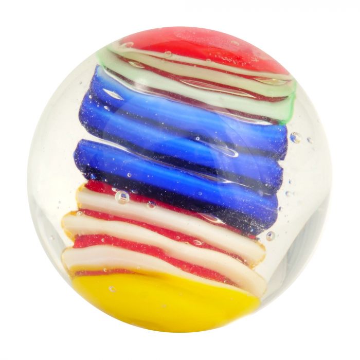 Deze handgemaakte knikker heeft een kern in de vorm van een cocon. De kern is opgebouwd uit glas in verschillende kleuren (wit, geel, blauw, groen en rood).