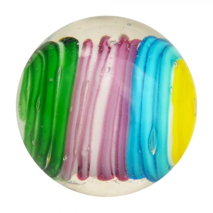 Deze handgemaakte knikker heeft een kern in de vorm van een cocon. De kern is opgebouwd uit glas in verschillende kleuren (wit, geel, lichtblauw, groen en roze).