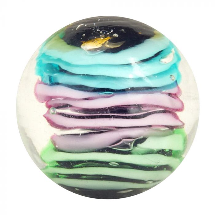 Deze handgemaakte knikker heeft een kern in de vorm van een cocon. De kern is opgebouwd uit glas in verschillende kleuren (zwart, geel, lichtblauw en roze).