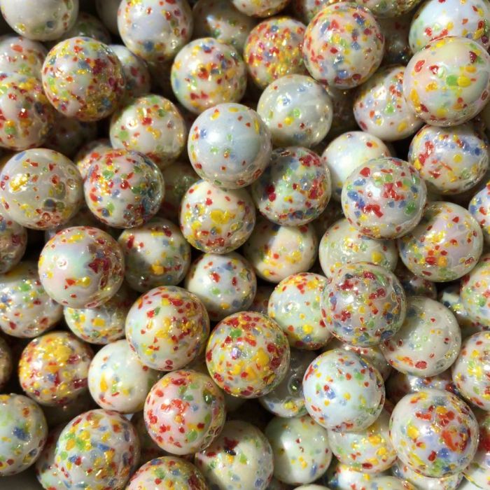 Ondoorschijnend witte knikker afgewerkt met glassplit in diverse kleuren. Na het vervaardigen van de knikker wordt het oppervlak opnieuw opgewarmd en door het gekleurde glassplit gerold. Zo krijgt de knikker een oneffen oppervlak.