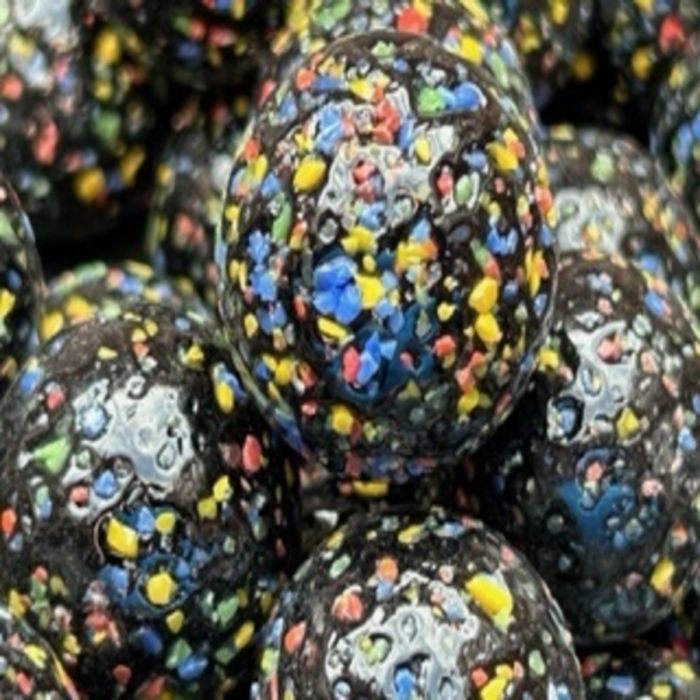 Glimmende zwarte knikker afgewerkt met glassplit in vrolijke kleuren. Hierdoor heeft de knikker een oneffen, ruw oppervlak.