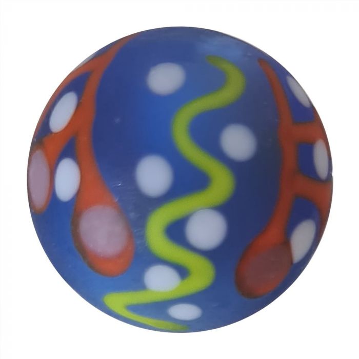 Deze handgemaakte knikker heeft een doorschijnend blauwe basis en is versierd met lijnen en tekens in diverse vrolijke kleuren. Het oppervlak van de knikker is bewerkt zodat deze mat is.