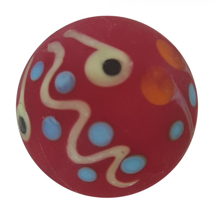 Deze handgemaakte knikker heeft een doorschijnend rode basis en is versierd met lijnen en tekens in diverse vrolijke kleuren. Het oppervlak van de knikker is bewerkt zodat deze mat is.