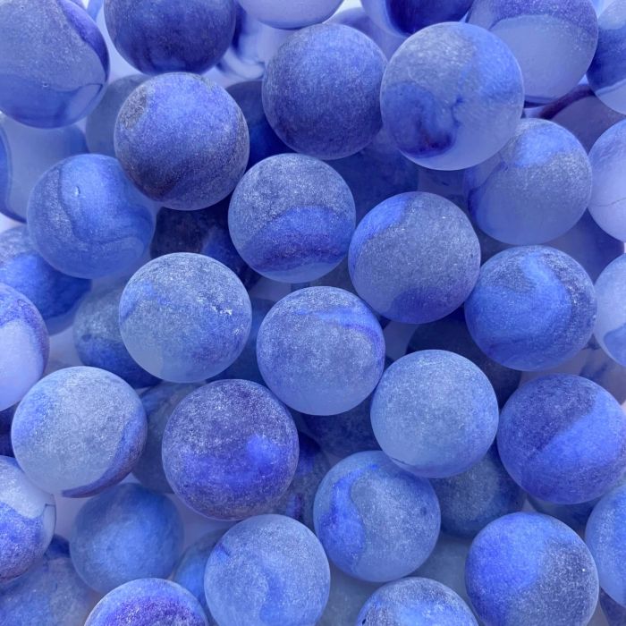Doorschijnende knikker met een blauwe vlek. De knikkers hebben een matte afwerking. Deze knikker is ook beschikbaar in andere kleuren en maten.
