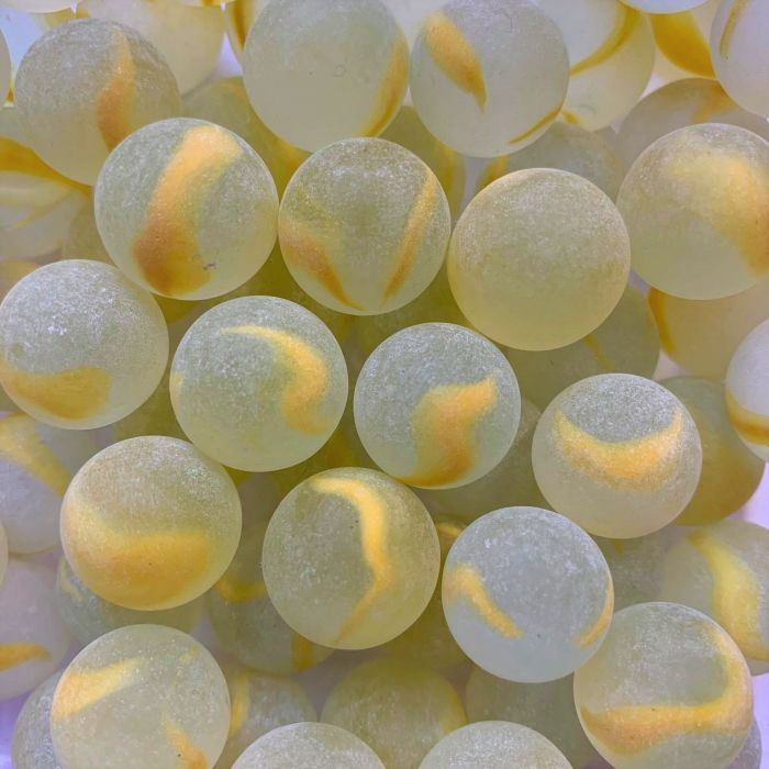 Doorschijnende knikker met een gele vlek. De knikkers hebben een matte afwerking. Deze knikker is ook beschikbaar in andere kleuren en maten.