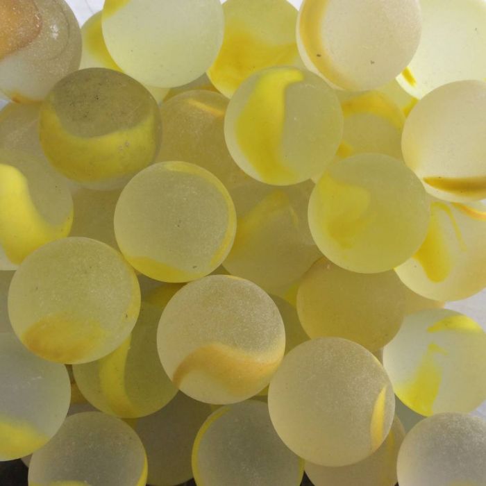 Doorschijnende knikker met een gele vlek. De knikkers hebben een matte afwerking. Deze knikker is ook beschikbaar in andere kleuren en maten.