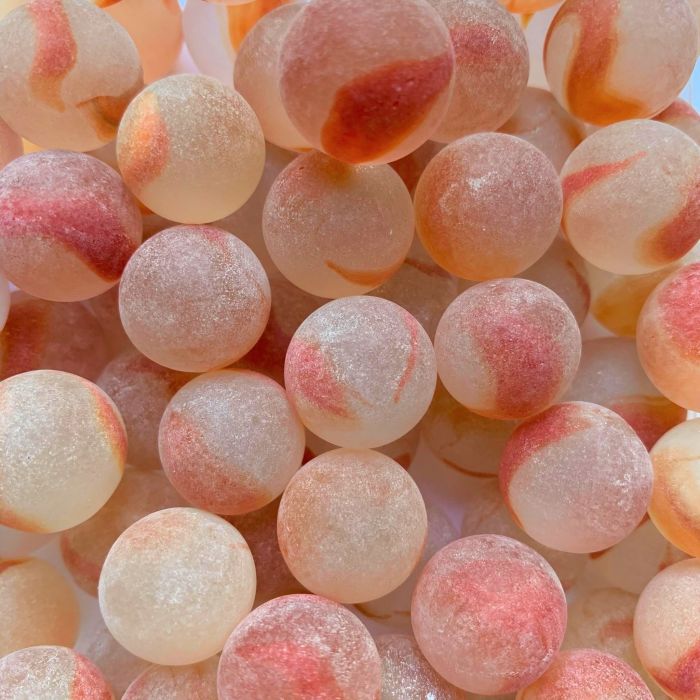 Doorschijnende knikker met een rode vlek. De knikkers hebben een matte afwerking. Deze knikker is ook beschikbaar in andere kleuren en maten.
