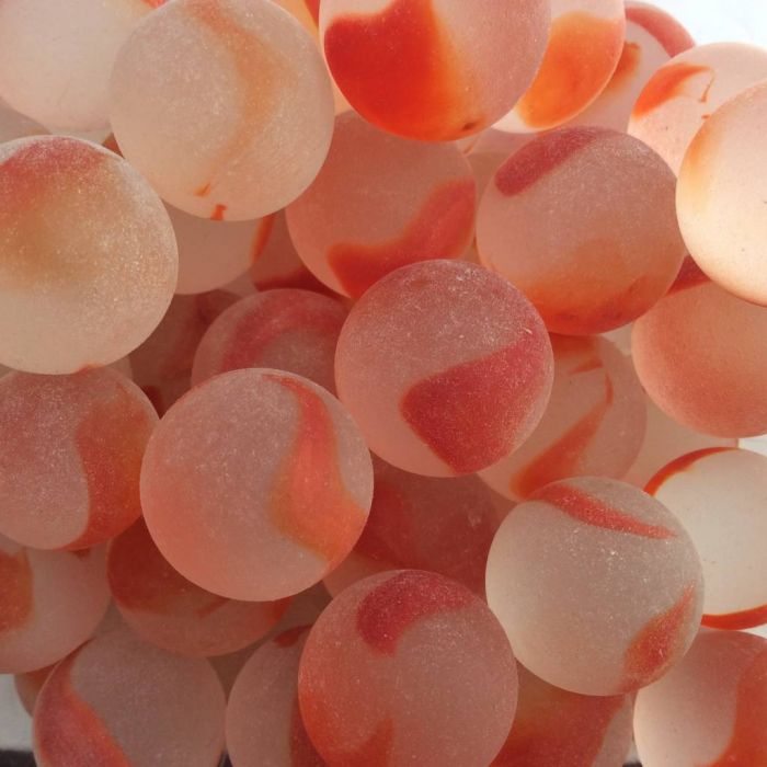 Doorschijnende knikker met een rode vlek. De knikkers hebben een matte afwerking. Deze knikker is ook beschikbaar in andere kleuren en maten.
