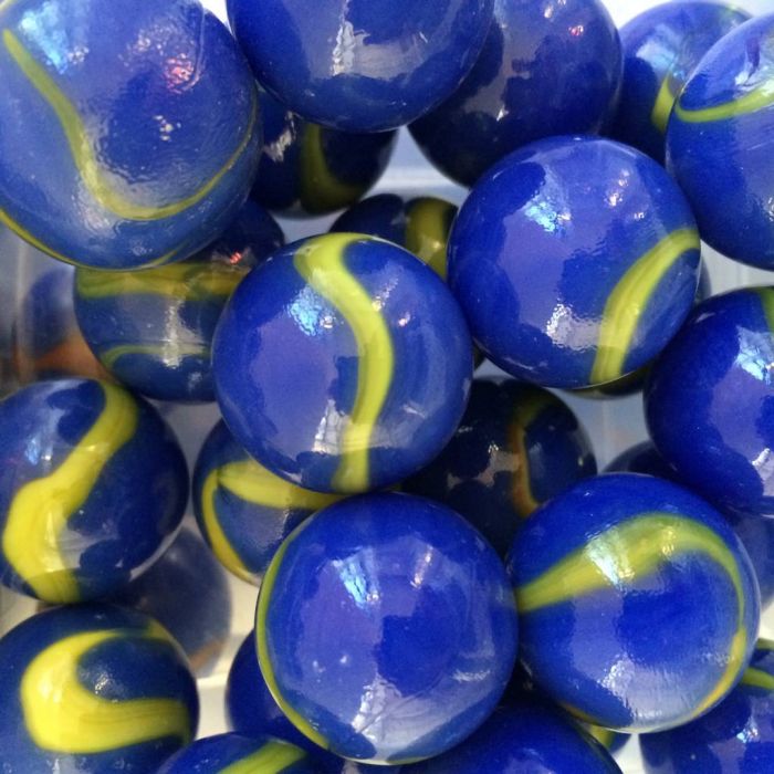 Ondoorschijnende, blauwe knikker afgewerkt met gele slierten over het oppervlak.