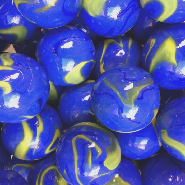 Grote, ondoorschijnend blauwe knikker met gele lijnen op het oppervlak.