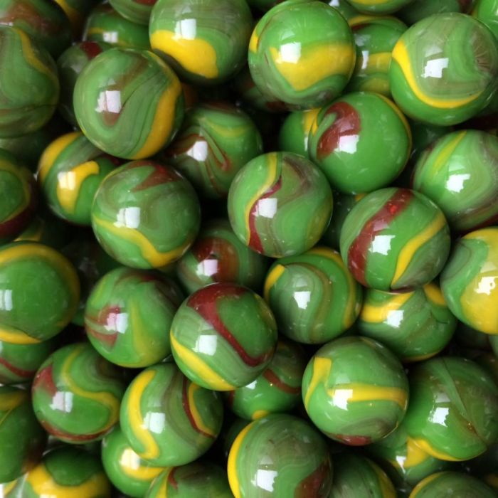 Ondoorschijnend groene knikker met gele en rode slierten over het oppervlak.