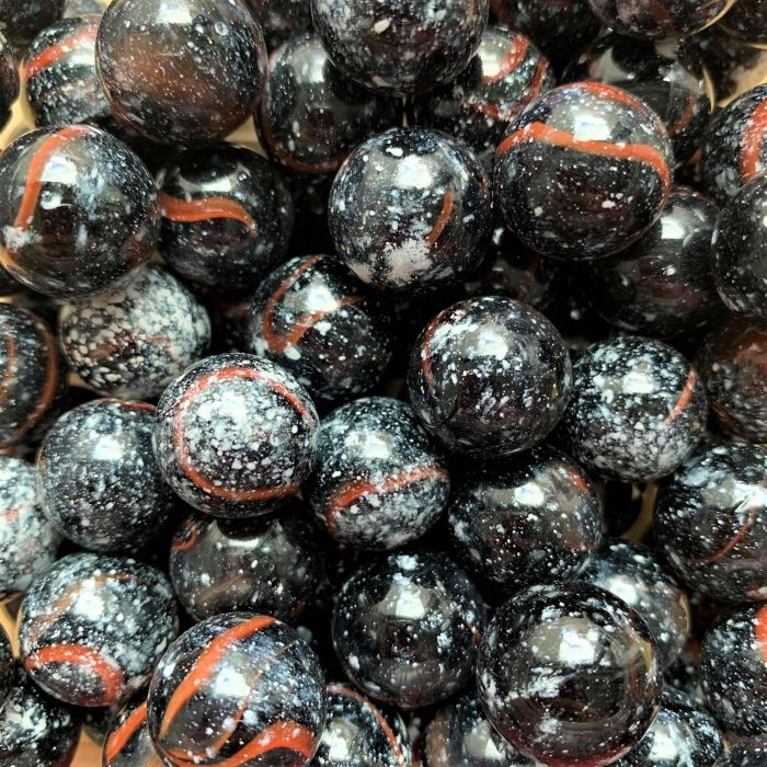 Ondoorschijnend zwarte knikker met rode strepen en witte spikkels op het oppervlak.