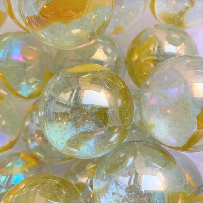 Transparante, grote knikker met een gele vlek. Deze knikker is ook beschikbaar in andere kleuren en maten of met een matte afwerking.