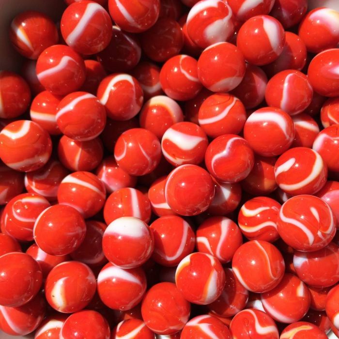 Ondoorschijnend rode knikker met een witte sliert over het oppervlak.