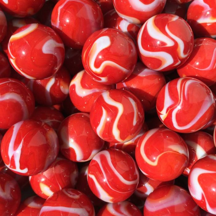 Ondoorschijnend rode knikker met witte strepen over het oppervlak.