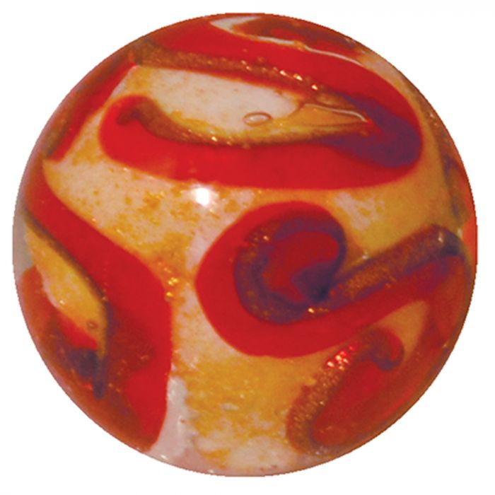 Deze handgemaakte knikker heeft een witte kern die is bestrooid met goudkleurig stof. De knikkers worden afgewerkt met sierlijke lijnen.