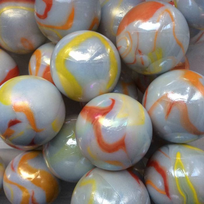 Ondoorschijnend witte knikker met gele en oranje strepen over het oppervlak.