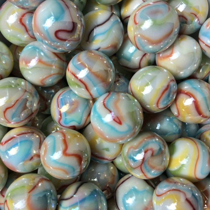 Een klassieker en nog steeds erg geliefd! Fee is een ondoorschijnend witte knikker afgewerkt met lijnen in diverse vrolijke kleuren en een parelmoerglans. Bijzonder aan deze knikker zijn de vele kleuren die er in verwerkt zijn, iets wat bij machinaal gemaakte knikkers niet vaak voorkomt.