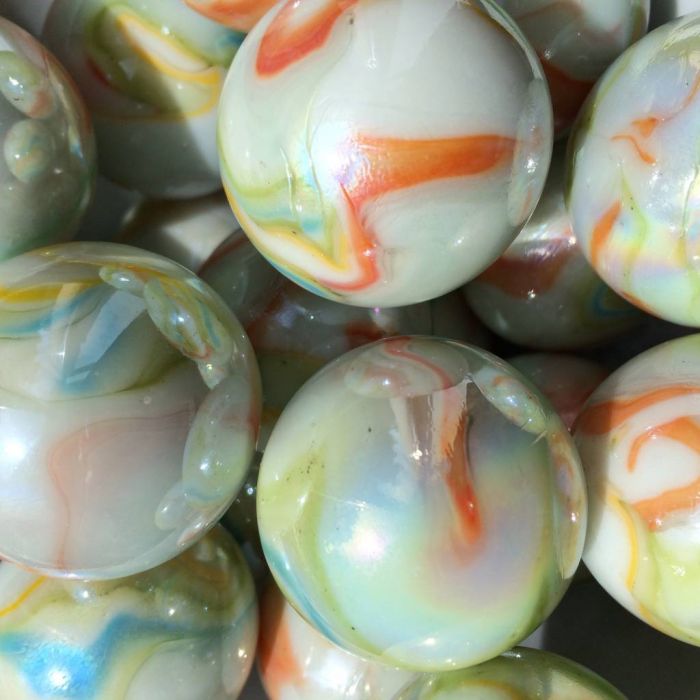 Een klassieker en nog steeds erg geliefd! Fee is een ondoorschijnend witte knikker afgewerkt met lijnen in diverse vrolijke kleuren en een parelmoerglans. Bijzonder aan deze knikker zijn de vele kleuren die er in verwerkt zijn, iets wat bij machinaal gemaakte knikkers niet vaak voorkomt.