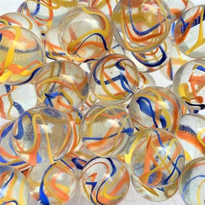 Transparante knikker met gele, rode en blauwe slierten die als slingers over en doorheen de knikker lopen.