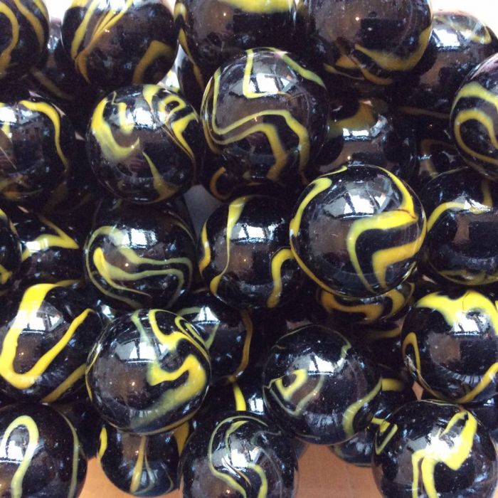 Ondoorschijnende zwarte bonk met gele lijnen op het oppervlak.