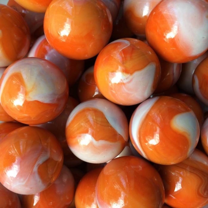 Ondoorschijnende, oranje reuzenbonk afgewerkt met witte vlekken.