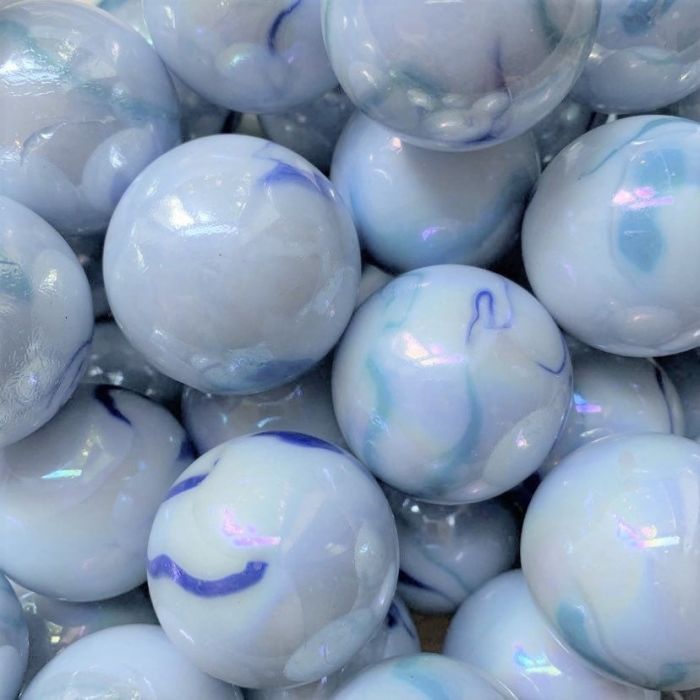 Ondoorschijnend witte knikker met blauwe strepen in diverse tinten en afgewerkt met een iriserende laag.