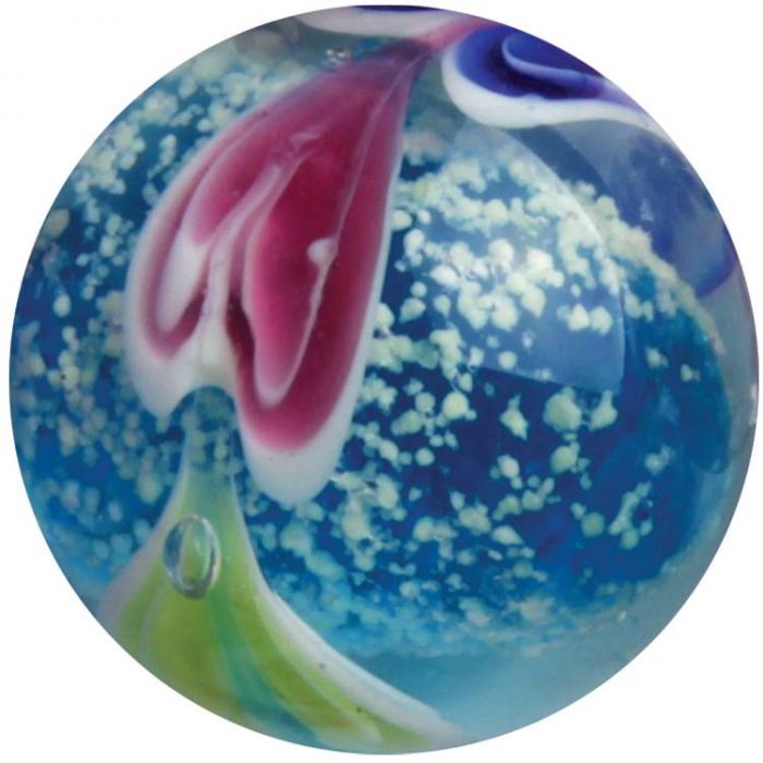 Een mooie handgemaakte knikker met een kern van blauw glas en glow in the dark-spikkels. Deze knikker is afgewerkt met een ring van kleurrijke hartjes.