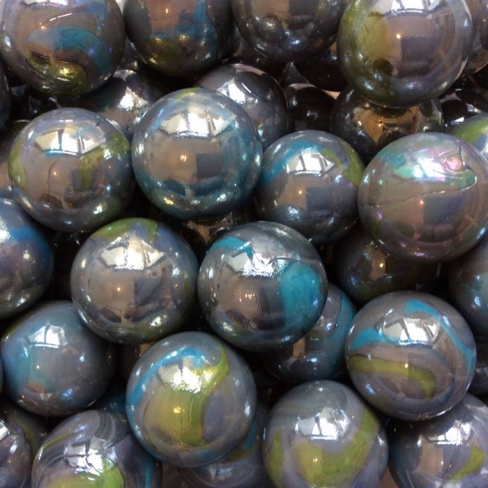 Zilvergrijze bonk met groene en lichtblauwe strepen op het oppervlak. Deze knikkers zijn afgewerkt met een mooie parelmoerglans.