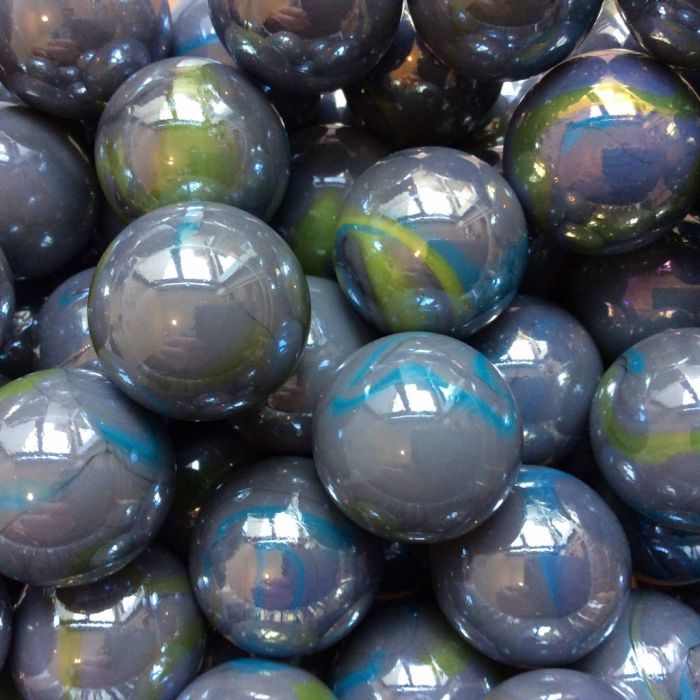 Grote zilvergrijze knikker met groene en lichtblauwe strepen op het oppervlak. Deze knikkers zijn afgewerkt met een mooie parelmoerglans.