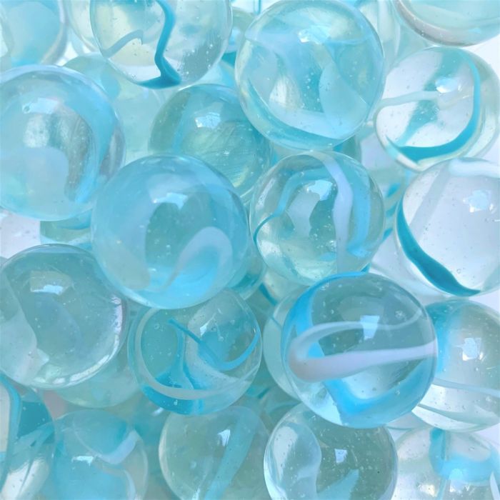 Transparante knikker met witte en lichtblauwe slierten die doorheen de knikker lopen.