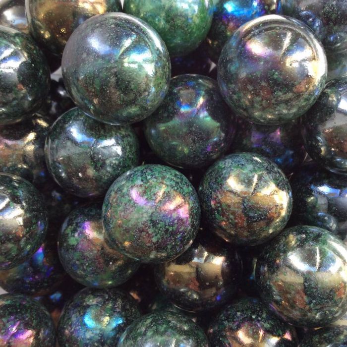 Ondoorschijnend zwarte knikker met witte en groene vlekjes over het gehele oppervlak. Deze knikkers zijn afgewerkt met een iriserende coating.