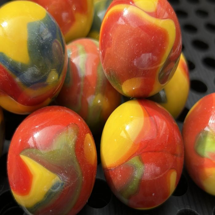 Undurchsichtige Murmel. An der Oberfläche der Murmeln verlaufen gelbe und rote