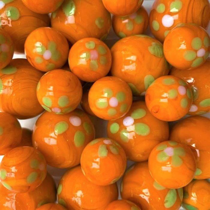 Deze handgemaakte knikker heeft een ondoorschijnend oranje basis en is afgewerkt met een vrolijk bloemenmotief. De bloemetjes hebben een witte kern en lichtgroene bloemblaadjes.