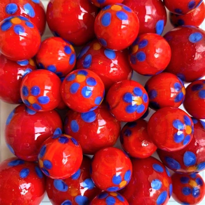 Deze handgemaakte knikker heeft een ondoorschijnend rode basis en is afgewerkt met een vrolijk bloemenmotief. De bloemetjes hebben een oranje kern en blauwe bloemblaadjes.