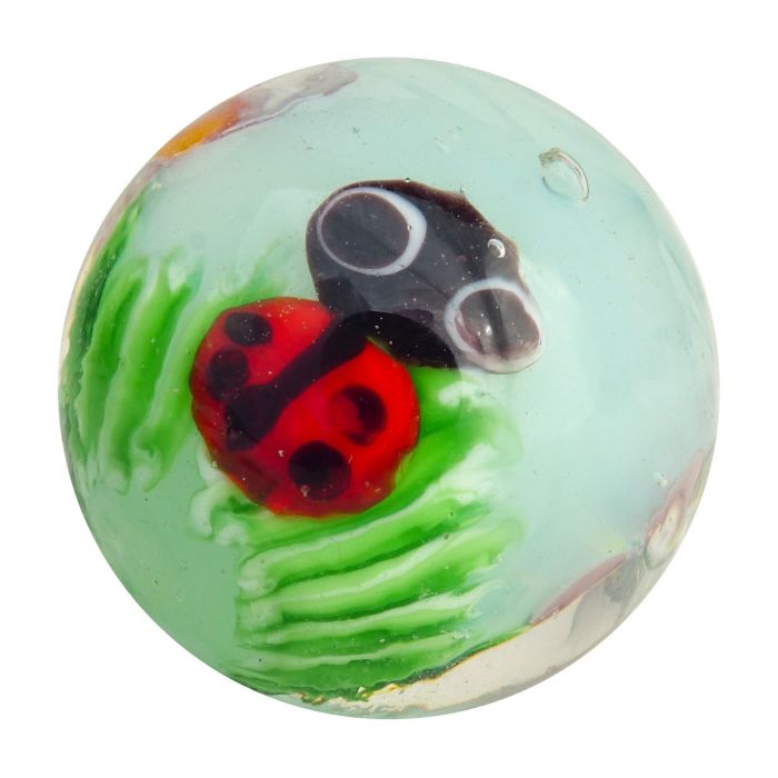Deze knikkers zijn prachtig handgemaakte knikkers met een lichtblauwe achtergrond en een tekening van een lieveheersbeestje met bloemen.