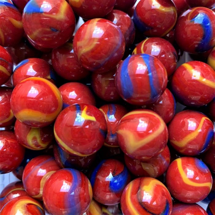 Ondoorschijnend oranje-rode knikker. Deze kleine knikkers zijn afgewerkt met blauwe en gele strepen.