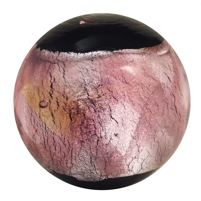 Deze handgemaakte knikker heeft een zwarte kern die is bedekt met een gekleurde zilverstrook en afgewerkt met een sierlijk lijnenpatroon.