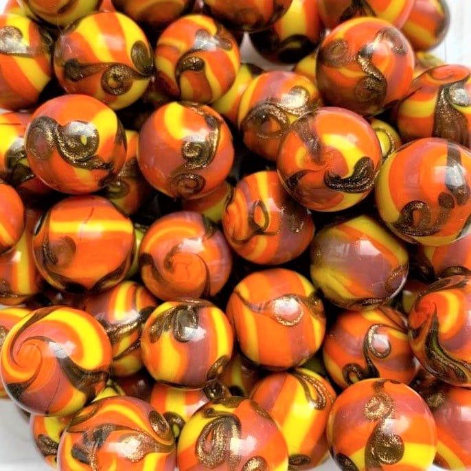 De knikkers hebben een doorschijnende kern die omhuld is met een spiraal van oranje, geel en lila glas. De spiraal wordt onderbroken door een sierlijk patroon in goudpoeder.