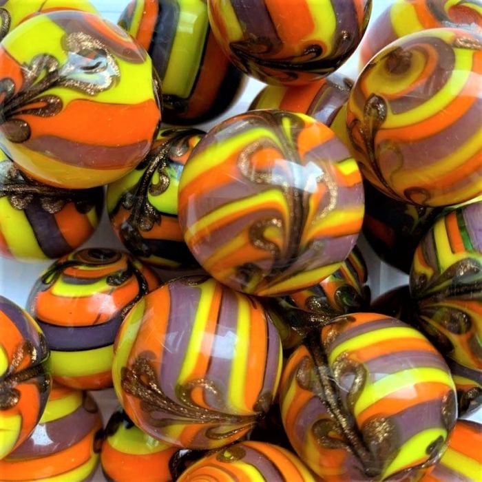 De knikkers hebben een doorschijnende kern die omhuld is met een spiraal van oranje, geel en lila glas. De spiraal wordt onderbroken door een sierlijk patroon in goudpoeder.