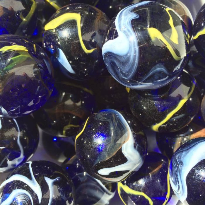 Reuzenbonk van transparant blauw glas afgewerkt met gele, rode en witte strepen.