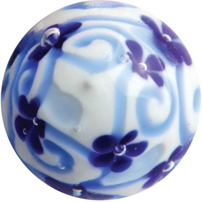 Handgemaakte, witte knikker afgewerkt met donkerblauwe sliertjes en bloemen.