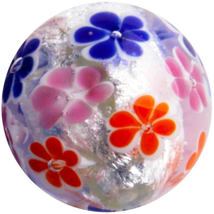 Een mooie handgemaakte knikker met een mysterieuze zilverwitte kern. Het oppervlak is afgewerkt met kleine, kleurrijke bloemetjes.