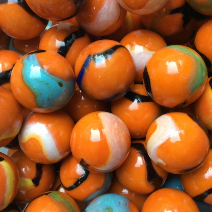 Ondoorschijnende bonk van oranjekleurig glas. De knikker is afgewerkt met diverse kleuren zoals wit, geel, groen of blauw. De knikkers worden geassorteerd geleverd.