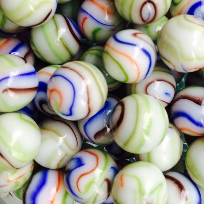 Ondoorschijnend witte knikker met oranje, bruine, blauwe en groene slierten over het oppervlak.