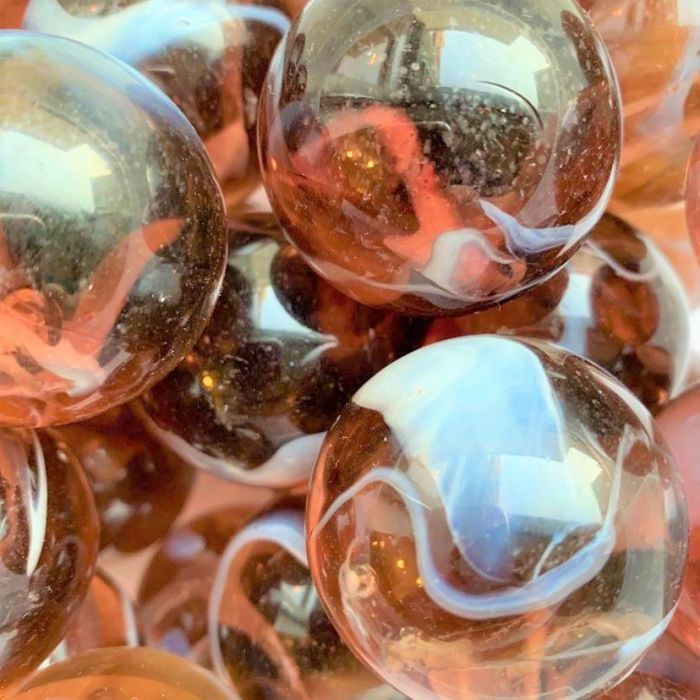 Doorschijnend violetkleurige knikker met witte wervelingen die over en door de knikker lopen.
